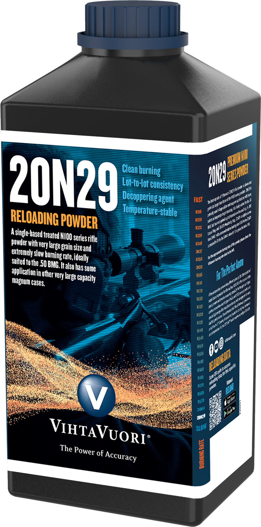 Vihtavuori 20N29 -jälleenlatausruuti 1 kg:n pakkauksessa. Vihtavuori -jälleenlatausruudit ovat puhtaasti palavia, lämpötilastabiileja ja tasalaatuisia.
