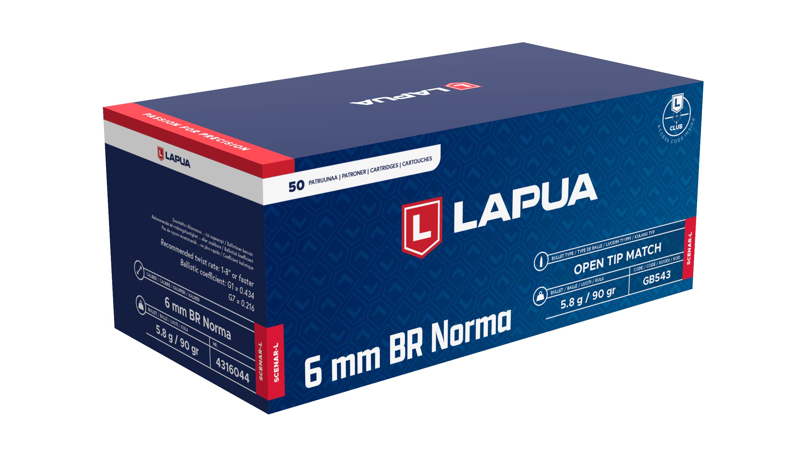 Lapua ScenarL 6 mm B.R Norma -kiväärinpatruuna, GB543 OTM -luodilla ladattu patruuna tarkkuusammuntaan ja metsästykseen. 50 kappaleen rasiassa.